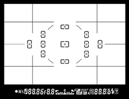 构图区域中照相机可用于自动对焦的位置在取景器中用对焦点表示。在单点自动对焦、动态区域自动对焦和 3D 跟踪时,拍摄者可手动选择对焦点。